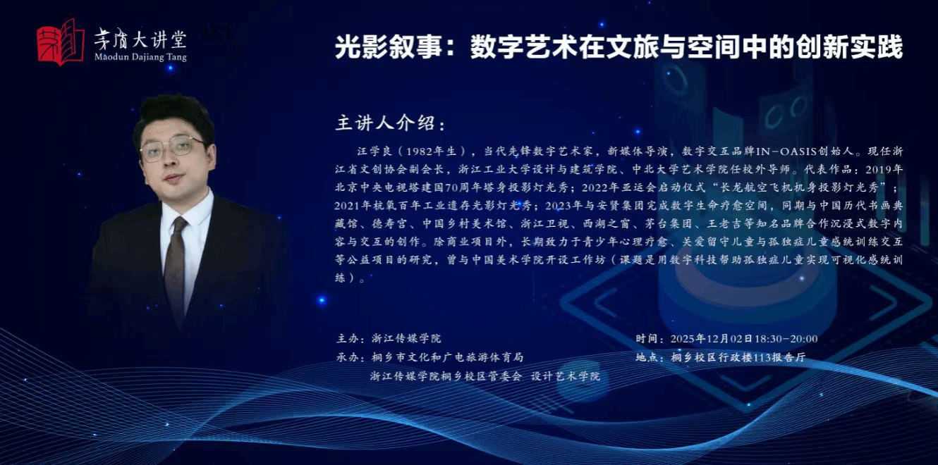 ,在桐乡校区行政楼报告厅带来一场题为《光影叙事——数字艺术在文旅与空间中的创新实践》的讲座。讲座通过丰富的项目实例,深入解析了数字艺术如何重塑空间体验并创造社会影响力。