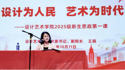 党委书记王丽以《设计为人民,艺术为时代》为题讲授“思政第一课”。她结合设计案例阐释“设计不仅是美学表达,更是社会责任的载体”,鼓励新生“将个人设计理想融入国家文化发展需求,让作品既有创意锋芒,更有民生温度”。